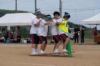中学生は、練習で上手く進むことができなかったため、一抹の不安がありましたが、本番では、練習の倍以上のスピードでグングン進んでいました。ゴール前ではどのチームも横一列に並ぶ、白熱した勝負でした。結果は赤団が一着となりました!