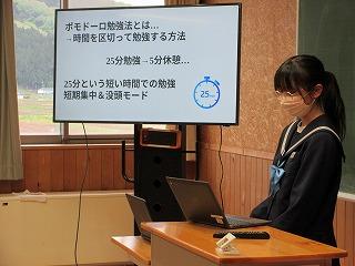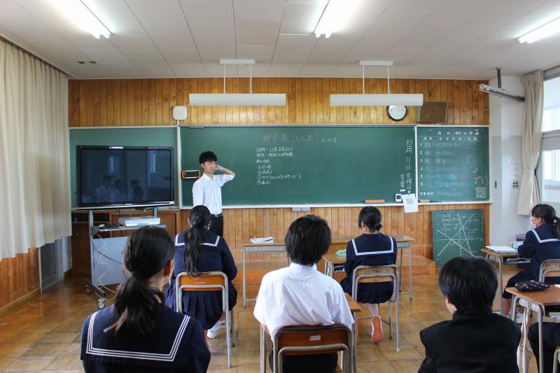 今年の文化祭は、昨年度大変お世話になった能登町立柳田中学校との合同で開催されます。今日は、オンラインでの合同オリエンテーションが行われ、生徒会長による挨拶と、スローガンやプログラム等について確認をしました。