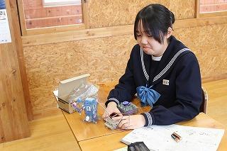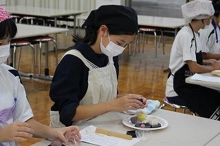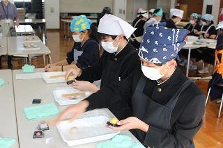 今回は、行松さんこだわりの和菓子「栗きんとん」を一から作りました。作業は、①蒸した栗を切る、②栗肉をとる、③栗肉をこす、④栗肉に味付けをする、⑤形をつくるの5段階ありました。栗を切るのと栗肉をこすのは先生が、栗肉をとるのは生徒が行いました。生徒たちは、スプーンを使って7kgの栗から栗肉を残さずとることの大変さを実感していました。⑤のきんとんの形を作るときは、栗きんとんの大きさや栗あんの量に気を付けて、丁寧に形を整えていました。