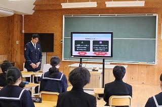 スライドを使いながら「検察庁、検察官はどのような仕事を行うのか」「検察官になるためには何が大切なのか」ということを詳しく教えていただきました。また、「諦めるのは簡単。続けることが重要。困難な壁に当たったとしても、諦めずに努力し続けてほしい。」と、後輩へのメッセージ、将来就きたい職を志す上で大切な姿勢についてのアドバイスもありました。生徒達は、これまで馴染みのなかった「検察庁」「検察官」「検察事務官」という仕事について、真剣に耳を傾けていました。