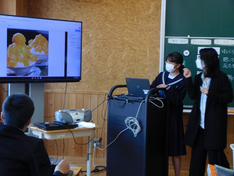 3年生が、「行きたい国」をタブレットを用いて、英語でプレゼンする授業を行いました。