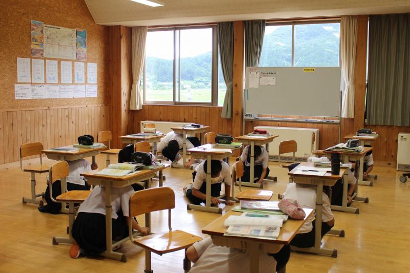 地震の被害から自分自身を守るための「しゃがむ」「隠れる」「じっとする」という安全行動に焦点をあてた訓練です。