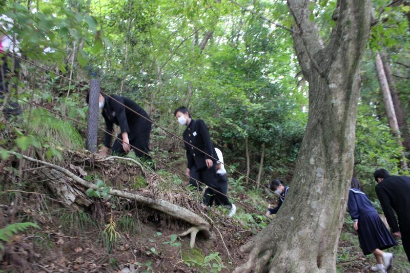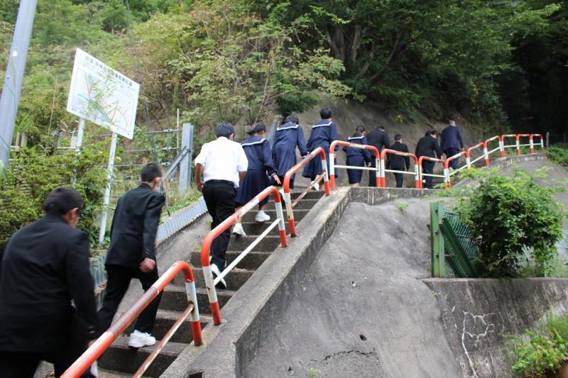 今回は、津波を想定して公園山(標高約50m)に避難する訓練を行いました。