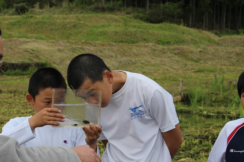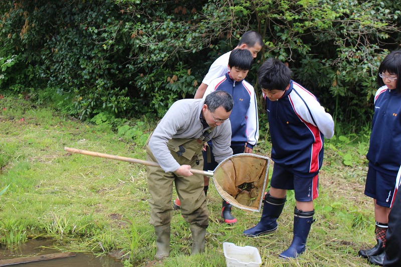 1年生が5・6時間目の理科の授業で、金蔵にある田んぼのビオトープへ