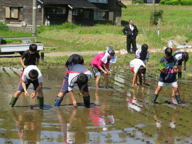 5限目の時間に、総合学習で1・2年生が金蔵地区の田んぼへ行き、