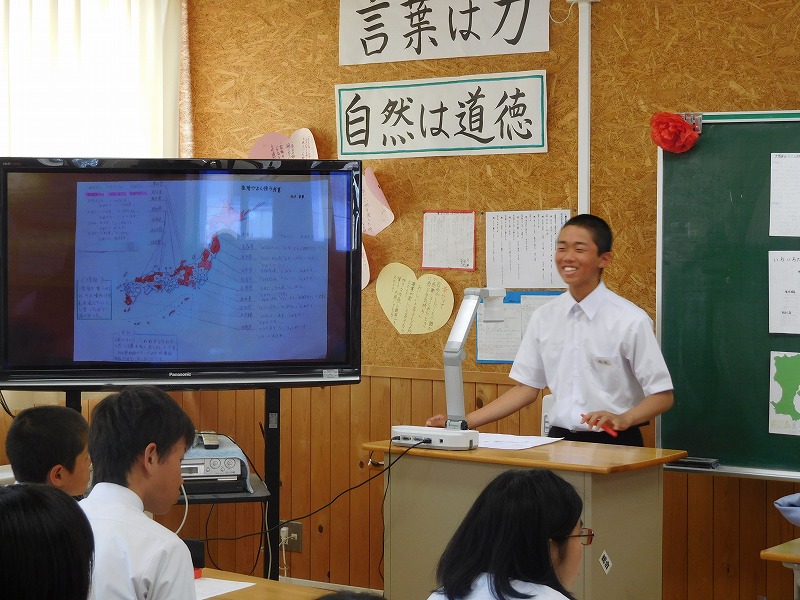 行いました。授業の狙いは、「2年生が方言について調べたレポートを分かり易く