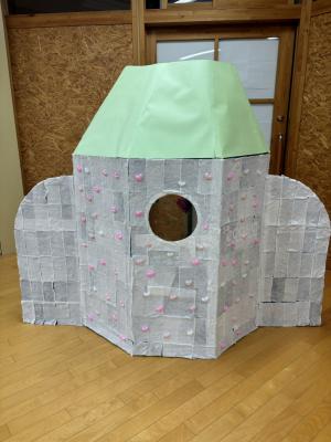 大きなダンボールをもらい、何を作るかみんなで話し合った結果、小さな子から大人まで入ることができ、撮影スポットにもなるかわいいロケットが完成しました。