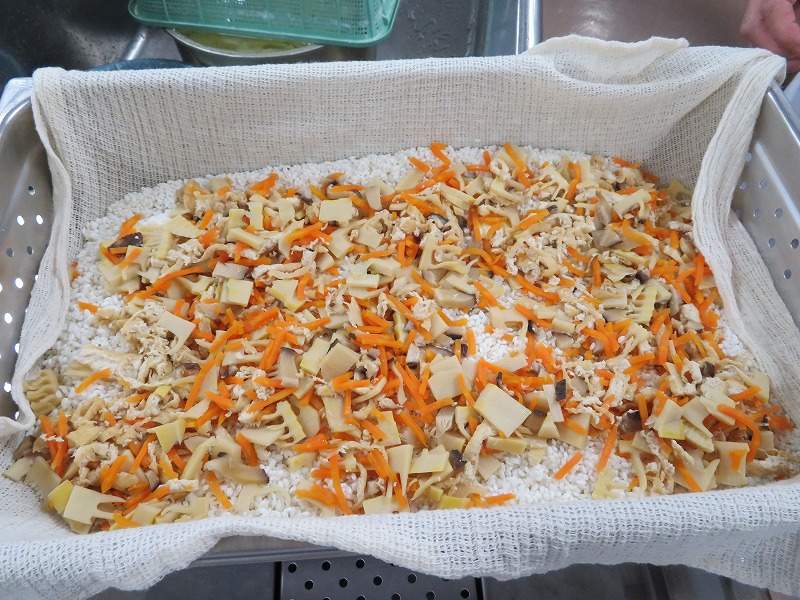 いつものご飯は、工場から配達してもらっていますが、今日は、スチームコンベクションオーブンの「蒸す」機能を使って、山菜おこわを作りました。