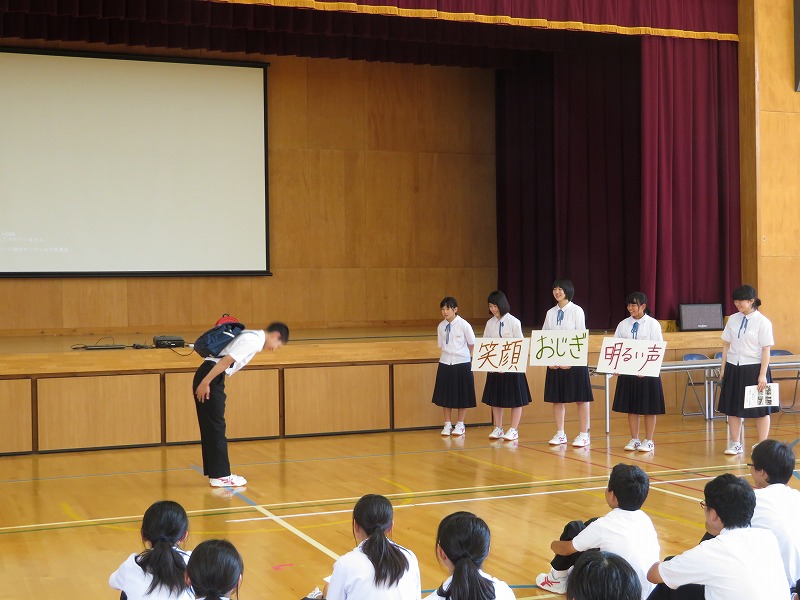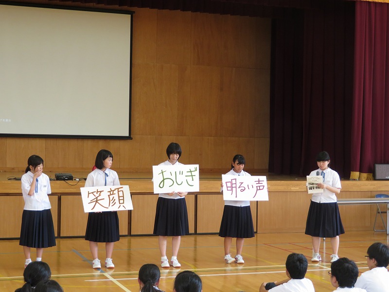 よい挨拶の3つのポイントとして、「笑顔」「おじぎ」「明るい声で」を意識して、全員が