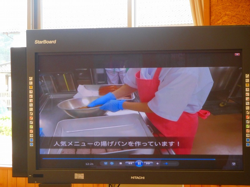 給食後に、給食の説明と給食作りの様子のムービーを見ていただきました。