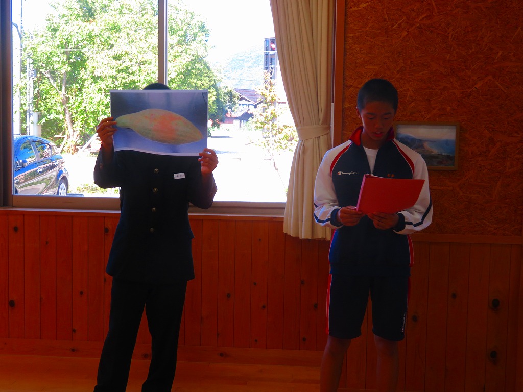 生活学習・給食委員会の生徒に町野産のかぼちゃと目によい食材について