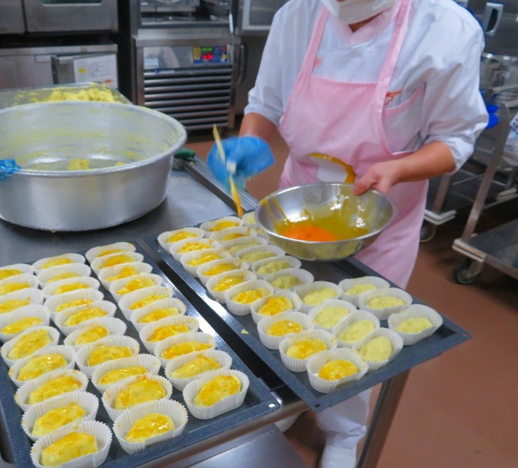 にたまごを塗ってオーブンで焼きます。甘くておいしいデザートで、生徒