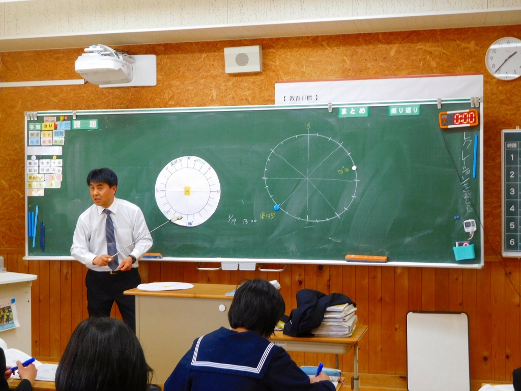 社会では「時差」の問題を円の絵を使い、わかりやすく教え合って取り組