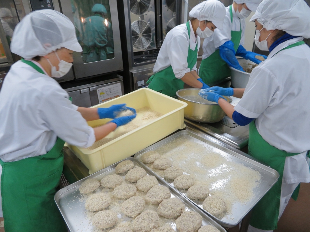 今日はハンバーグを作りました。給食のハンバーグは、絹豆腐とひき肉を