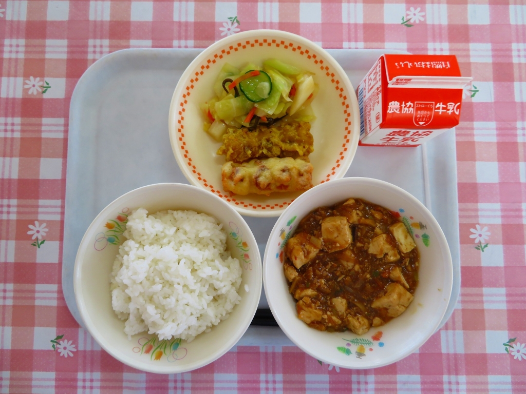 マーボ豆腐は給食の定番メニューですが、今日はマーボ大根にしました。