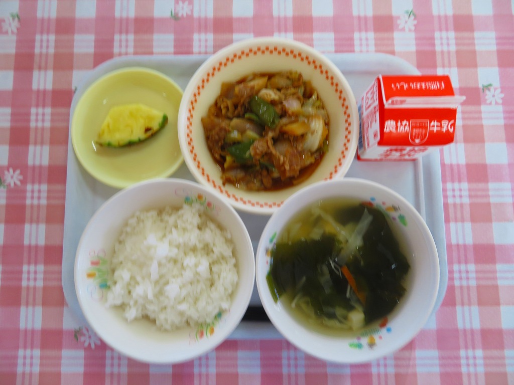 今日は野菜と肉がたっぷりのホイコーローです。給食では安全面から、