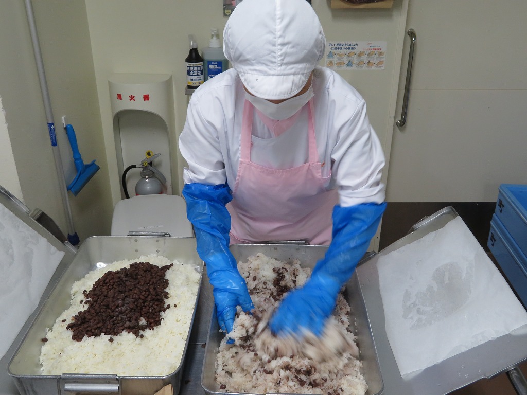 あずきごはんは、ゆでたあずきをごはんに混ぜ込みました。