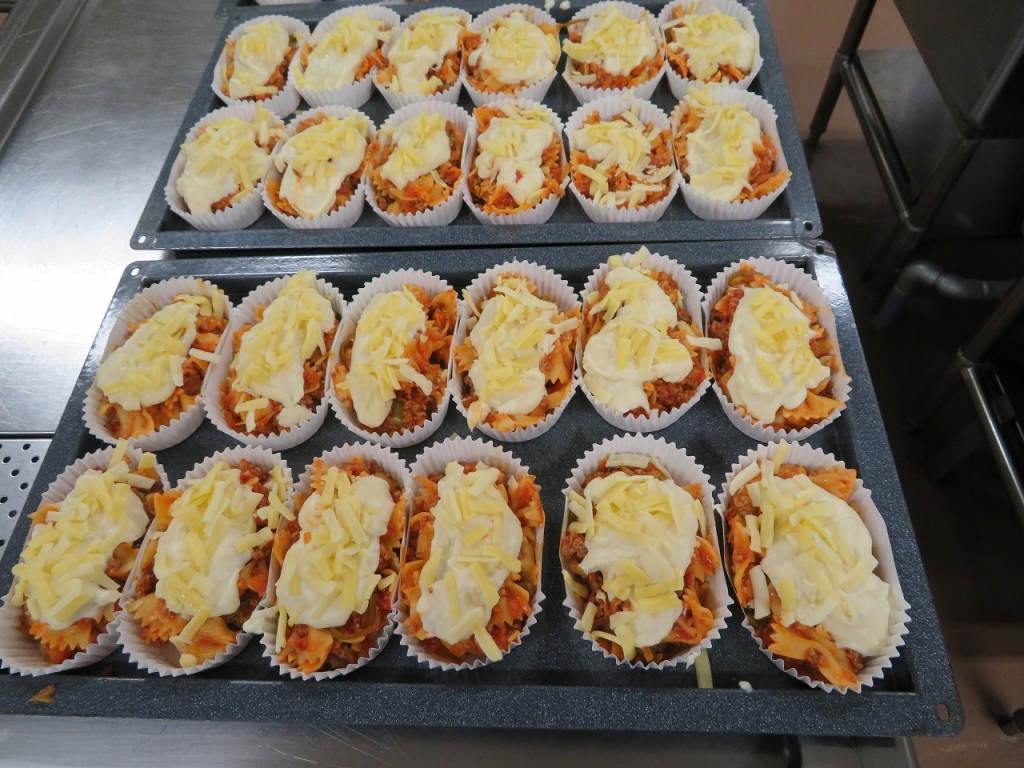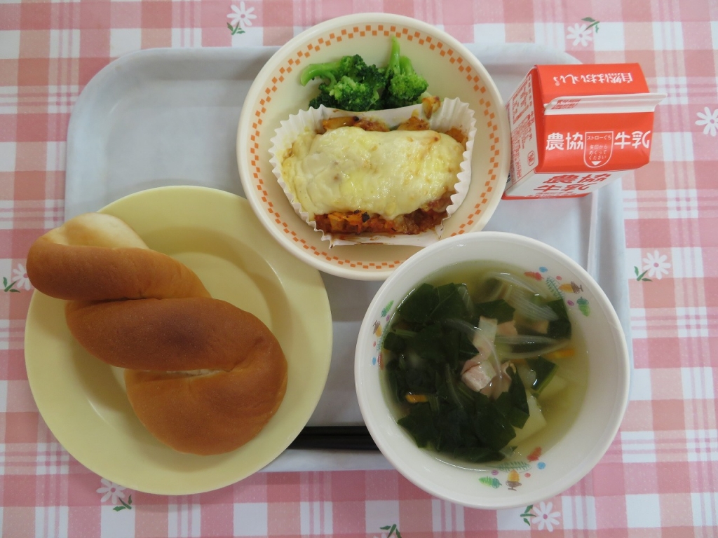 給食のラザニア風は、ケチャップやカットトマトで味付けた具を