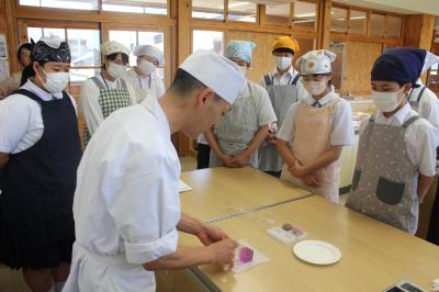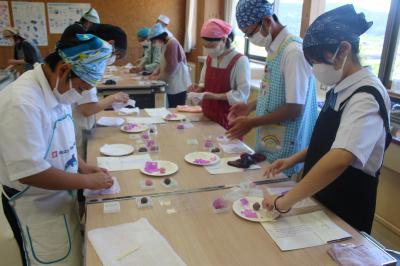 6月17日(火)に、小松市の行松宏展さんをお招きし、今年度初の「ふるさと魅力発見講座」を行いました。1年生は、初めて和菓子作りにチャレンジしました。4度目となる2、3年生も、これまでの体験で「餡玉(あんだま)」の扱いには慣れてきたものの、今回、新たに登場した「錦玉(きんぎょく)」と呼ばれる寒天の扱いには少々苦戦ぎみ。行松さんの「頑張れ!頑張れ!」という励ましを受けながら、ほぼ均等(?)に切った錦玉で餡の周りを飾り付け、鮮やかで涼しげな「紫陽花」をイメージした和菓子の花をたくさん咲かせました。