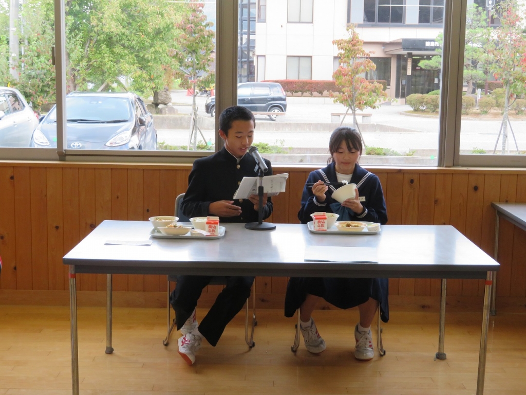 給食・情報委員会の生徒が藤井七段と世界バレーの話題を紹介してくれ