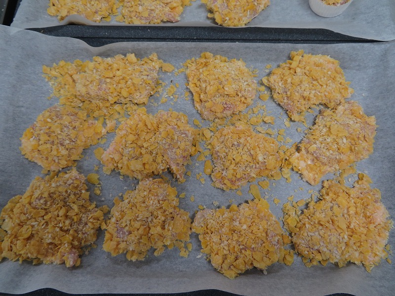 コーンフレークをつけてオーブンで焼きました。