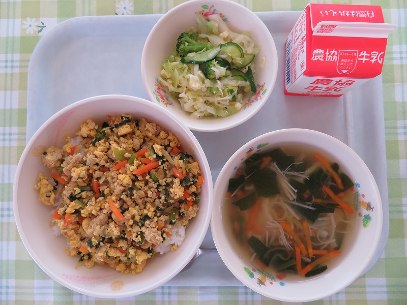 今日のそぼろごはんは、カレー粉で味付けています。