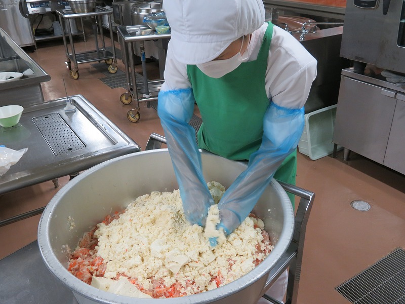 鶏ひき肉・木綿豆腐・たまねぎ・にんじんを混ぜ合わせてタネを