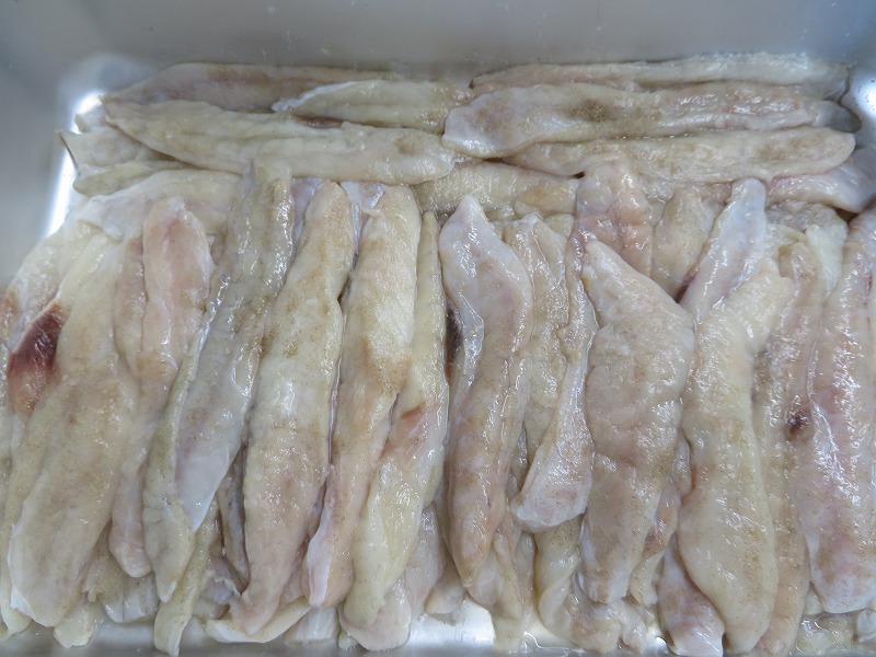 給食用に、きれいに下処理をし、パンにはさみやすいように切ったふぐの切り身を
