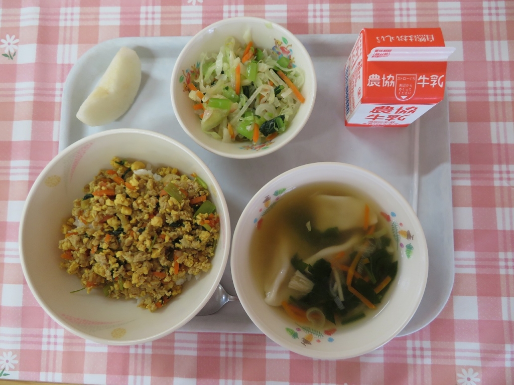 そぼろごはんは、カレー粉を入れているので、スパイシーな味付けで
