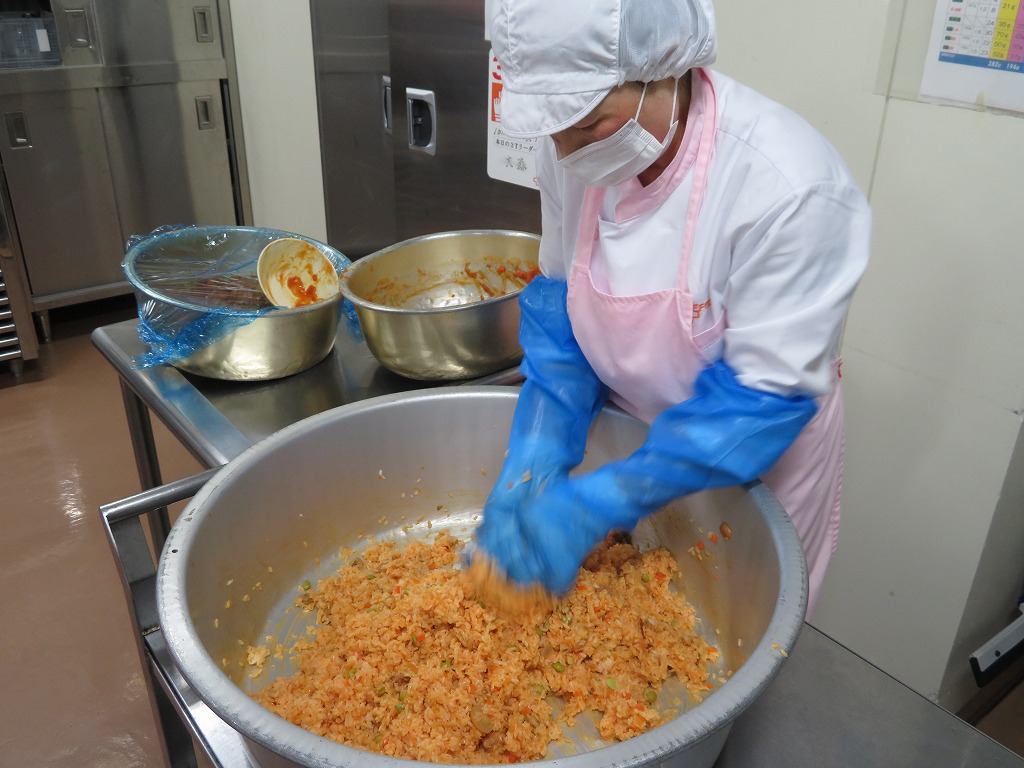 給食のオムライスは、釜でケチャップライスの具を作り、ご飯に