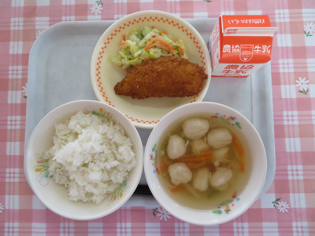 今日は、鮭のチーズフライとエビボールを使い、魚を使った給食でした。