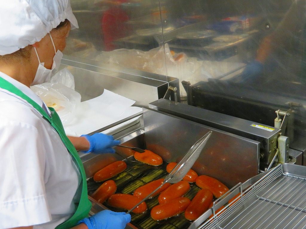 ひき肉・たまねぎ・にんじんなどを釜で炒めて具を作り、カップに入れて