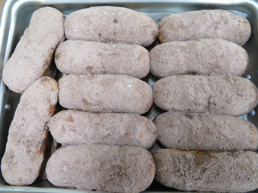 コッペパンをさっと油で揚げ、ココアと砂糖を混ぜた粉をつけます。