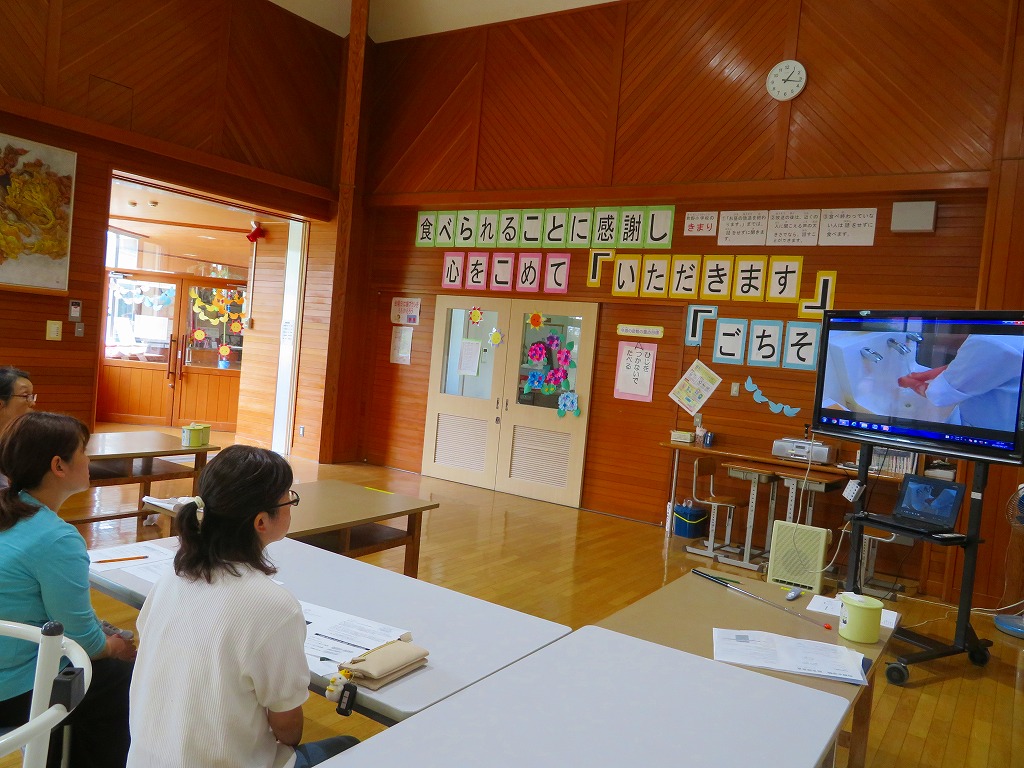 給食後には保護者の方に給食の説明と給食ができるまでの調理場の紹介
