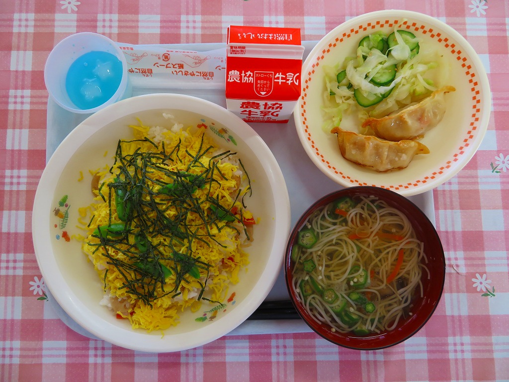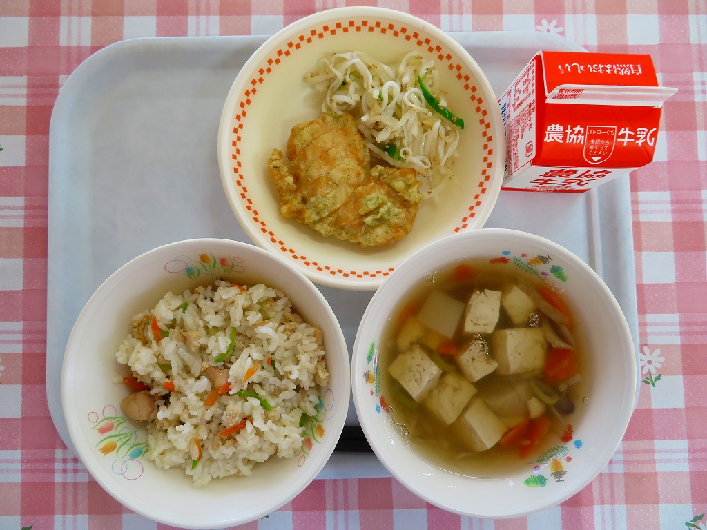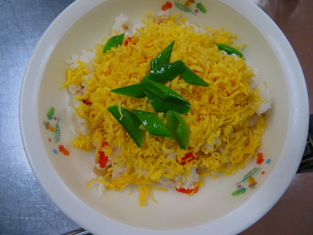 五目ごはんは彩りもきれいにできました。いつもより多いかな?と