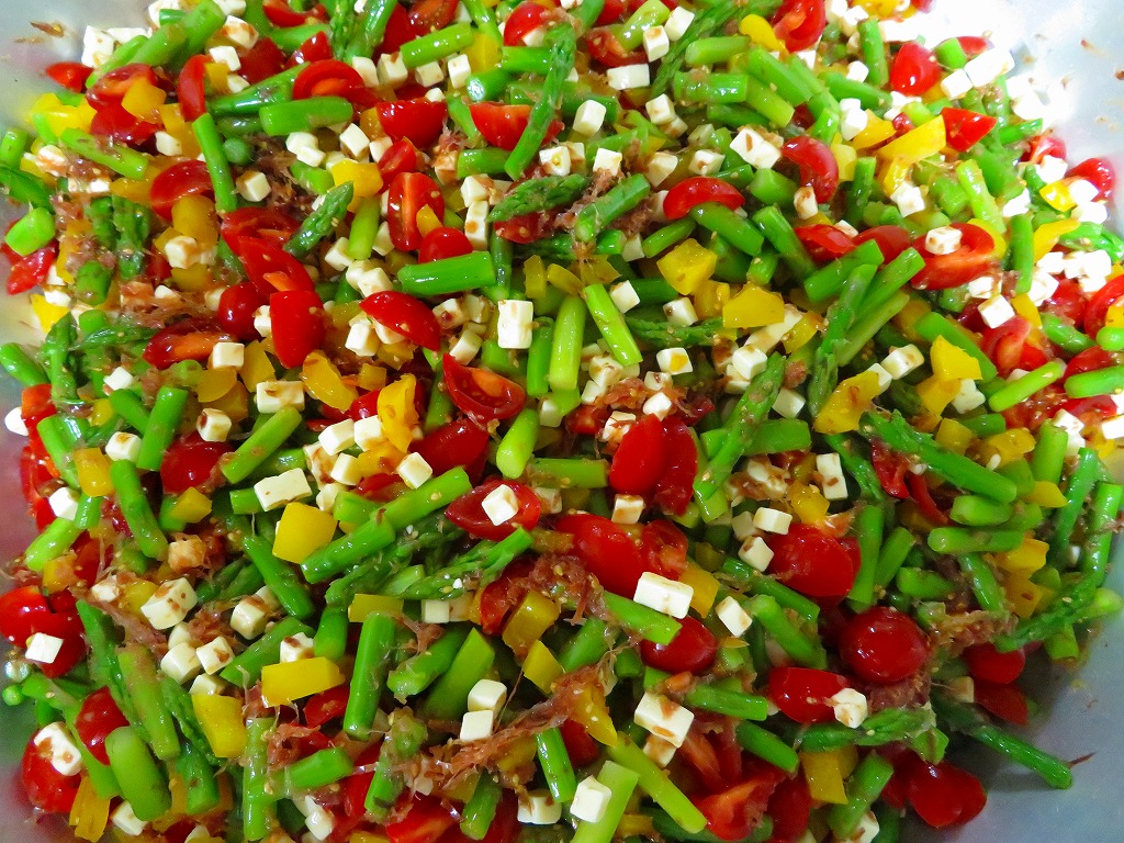 今日は、アスパラガス、パプリカ、ミニトマトを使ったカラフルチョップド