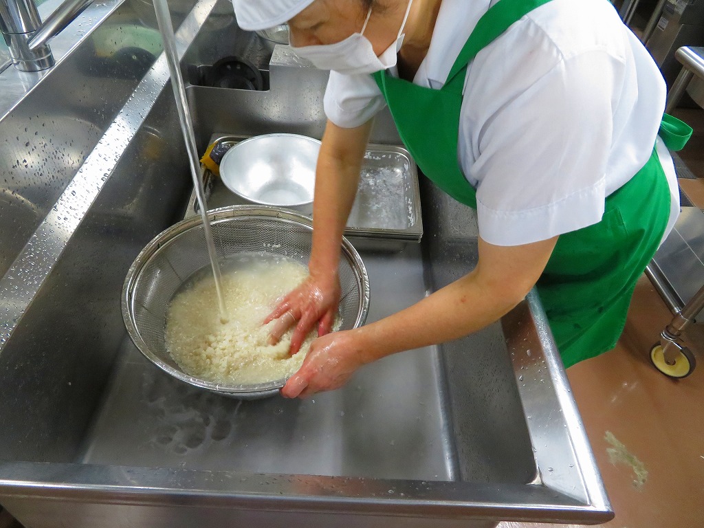 給食用の大人数分炊けるような炊飯器はないので、スチーム
