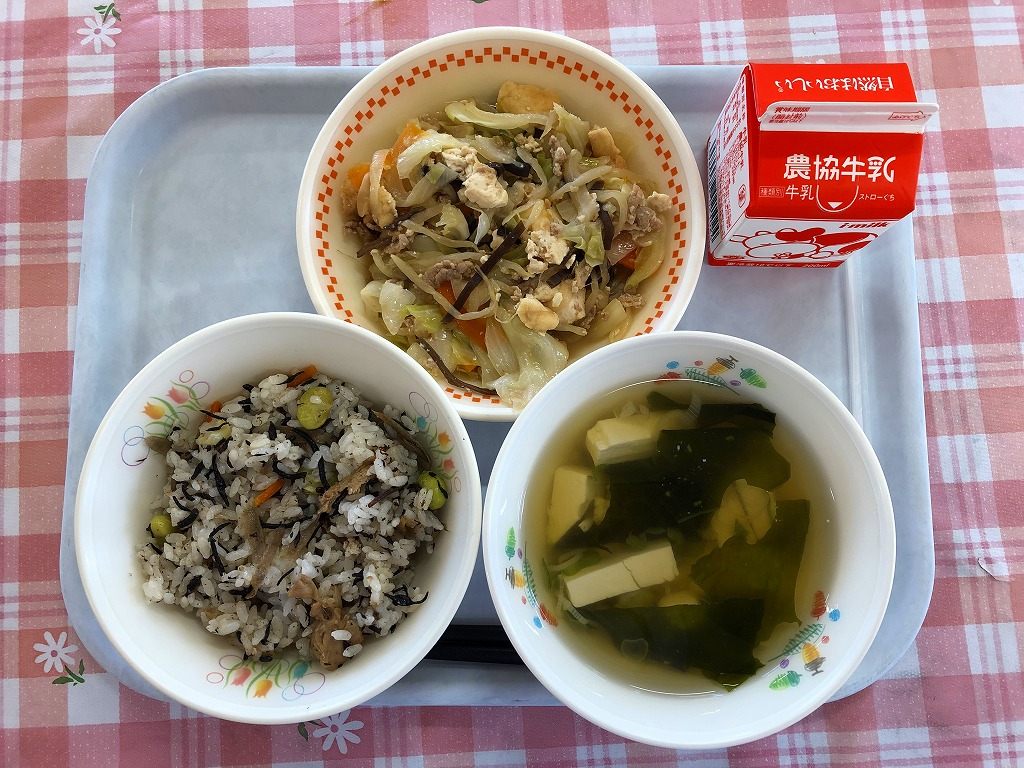 今日は栄養たっぷりのひじきごはんです。具がたくさんできて、いつもより