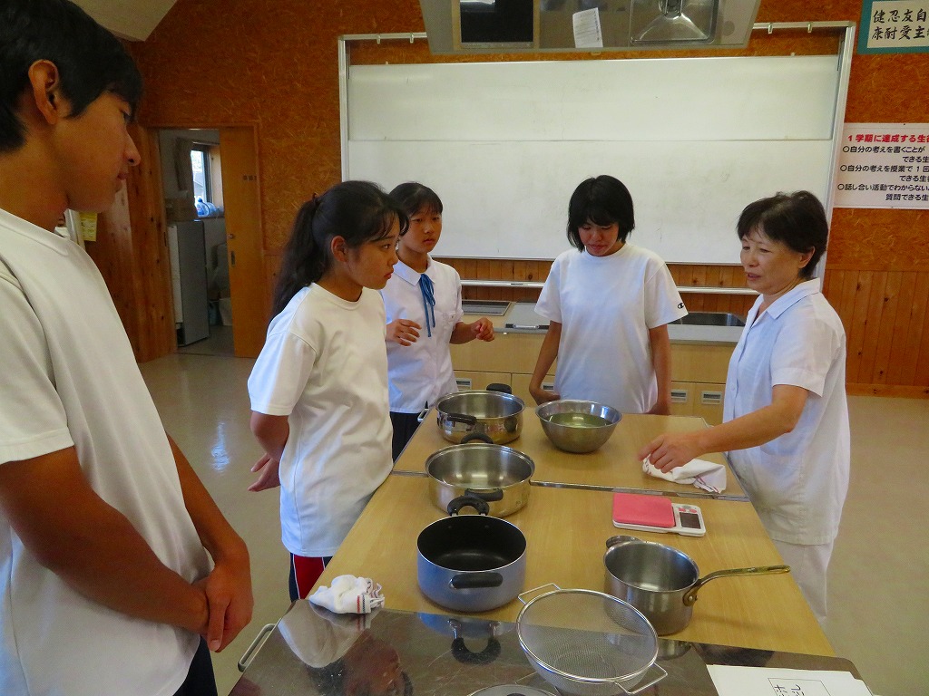 委員会の生徒が調理員さんにだしの取り方を教えてもらいながら、みそ汁を
