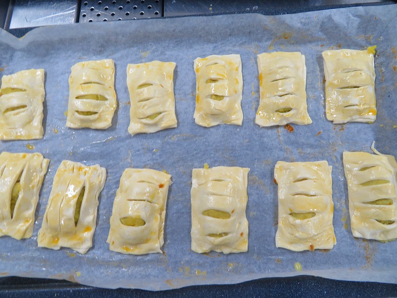 パイシートにフォークで穴をあけたり、切れ目を入れたり、たまごを塗った