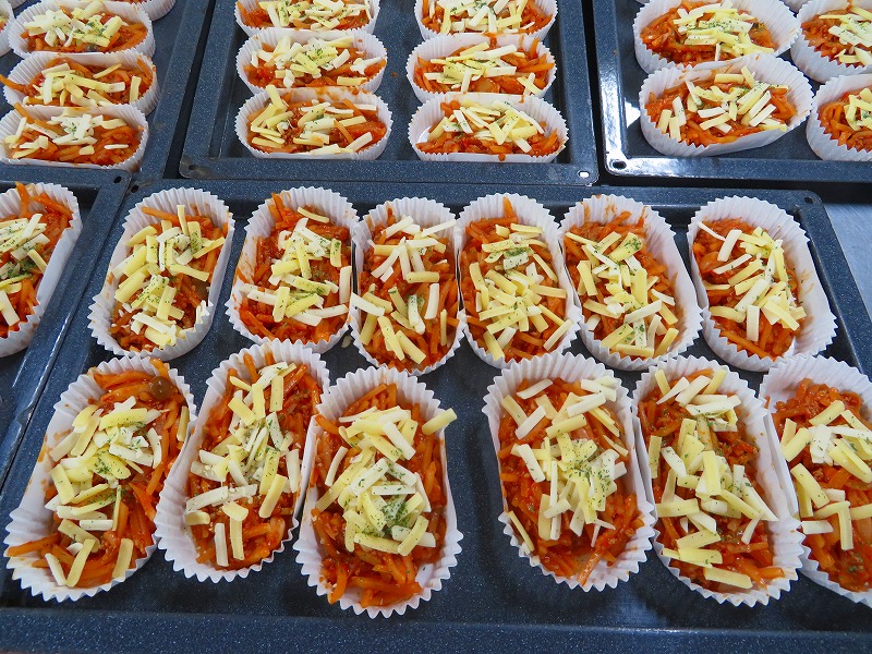 炒めて具を作り、カップに入れて最後にチーズ・パセリをのせて焼きました。