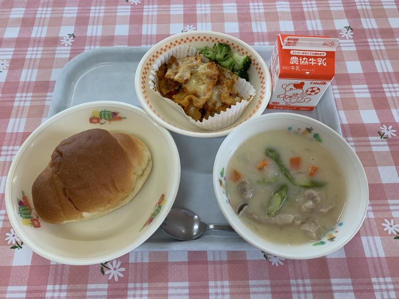 今日は、アスパラシチューとラザニア風です。アスパラシチューのアスパラは、町野産です。