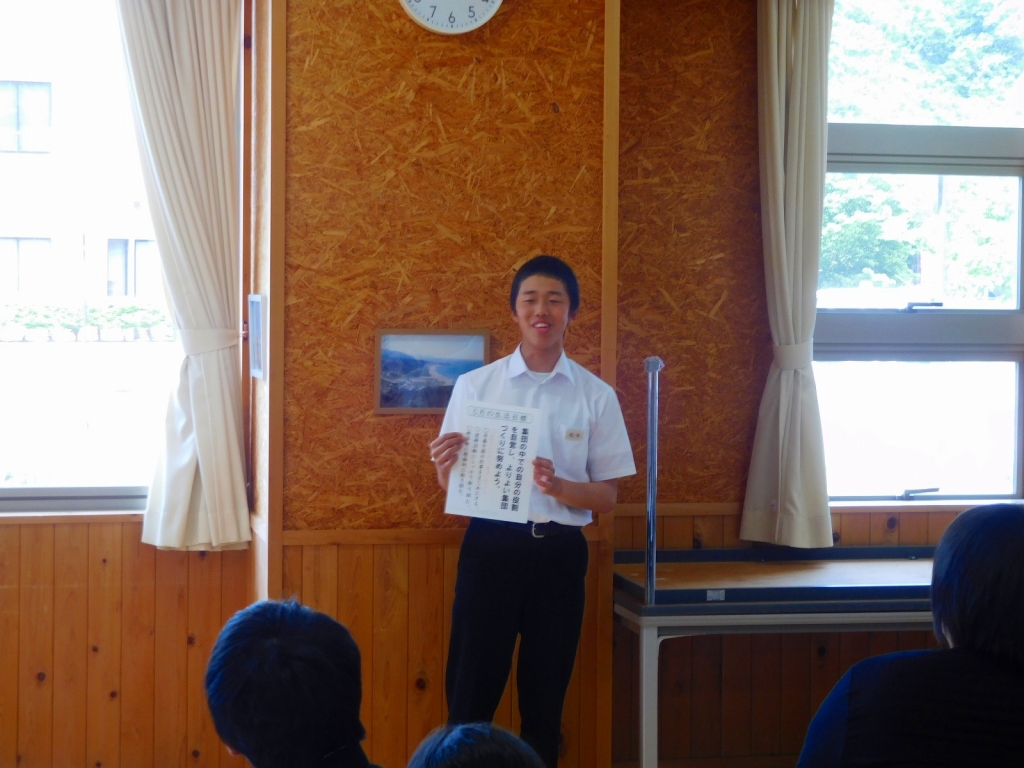 給食後、生徒会長の松本君より5月の生活目標を全校生徒に呼びかけ、