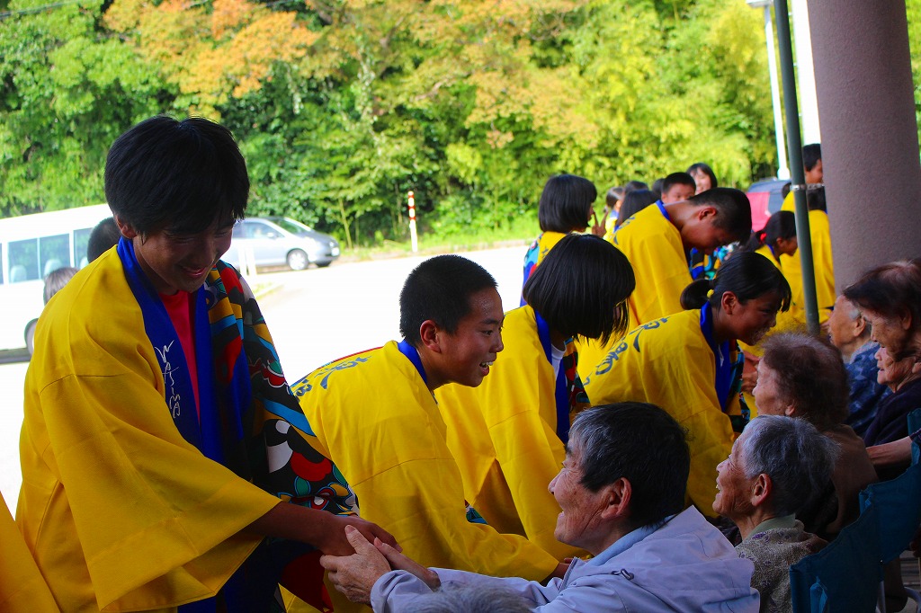 秋晴れの中、全校生徒で老人ホームみやびに訪問し、よさこいと体育祭応援