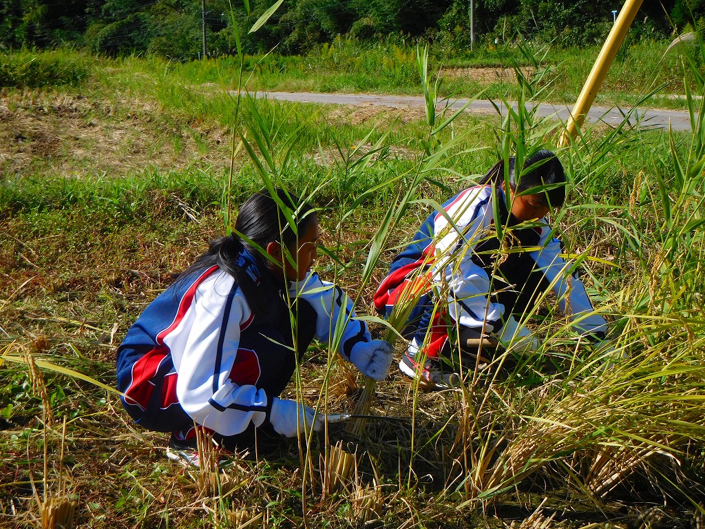 5月に田植えをした、コシヒカリを1年生が稲刈りとはざ干しを行いま