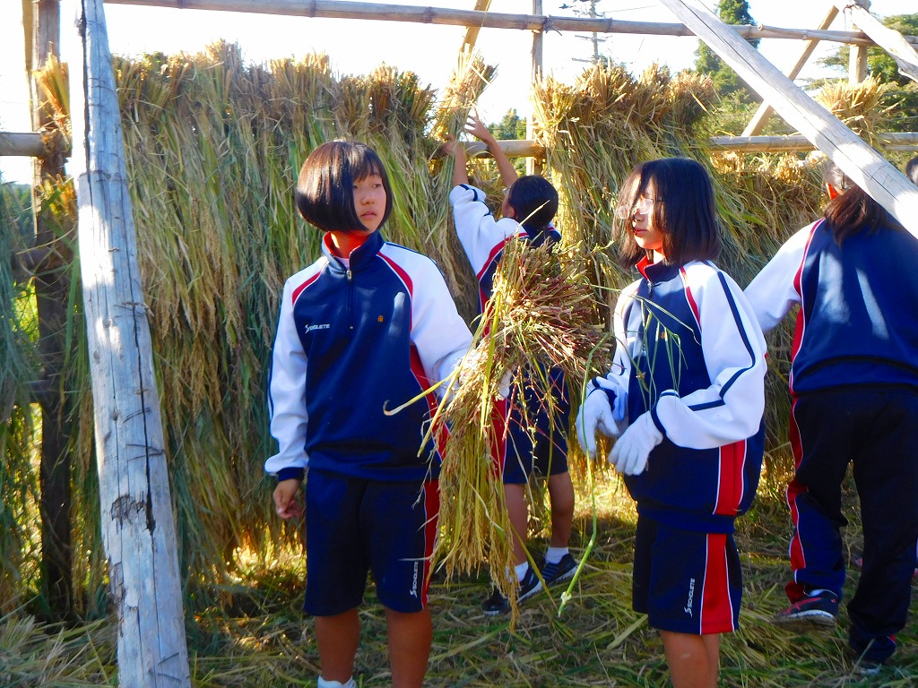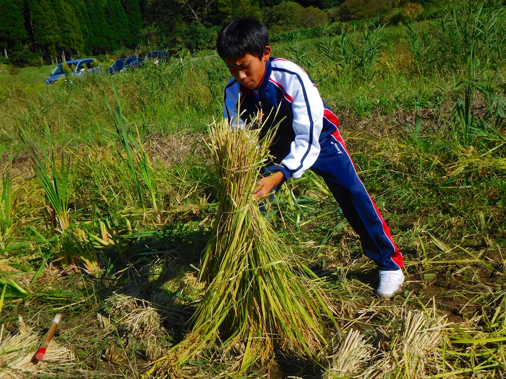 5月に田植えをした、コシヒカリを1年生が稲刈りとはざ干しを行いま