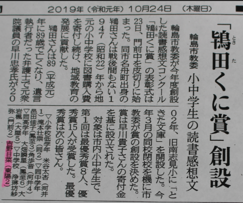 輪島市教育委員会が今年度市内読書感想文コンクール「鴇田くに賞」を