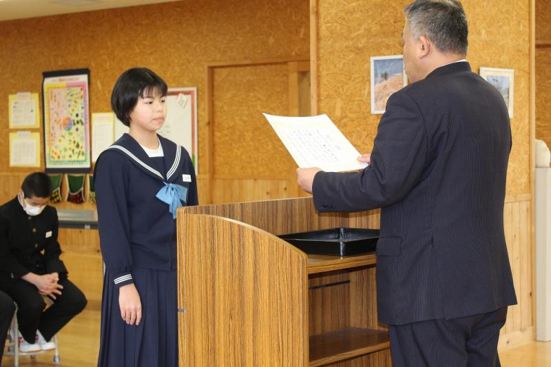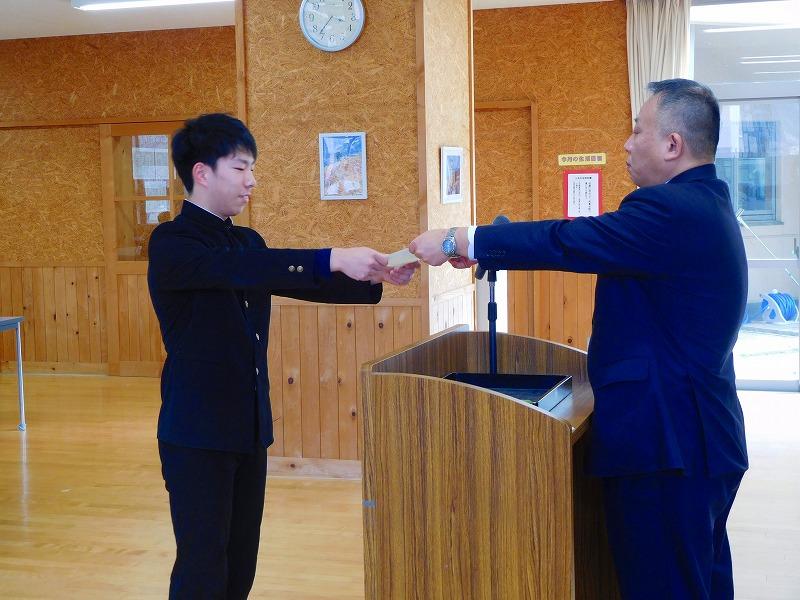 次に、3年生最後の定期テストの優秀賞と努力賞の表彰式を行い