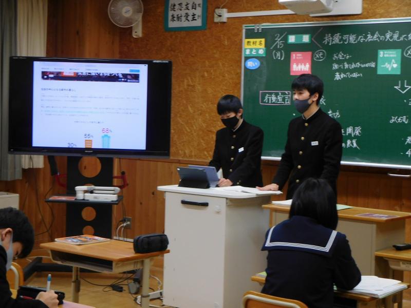 社会は「SDGsの調べたことの発表」でした。今年度の学校研究である