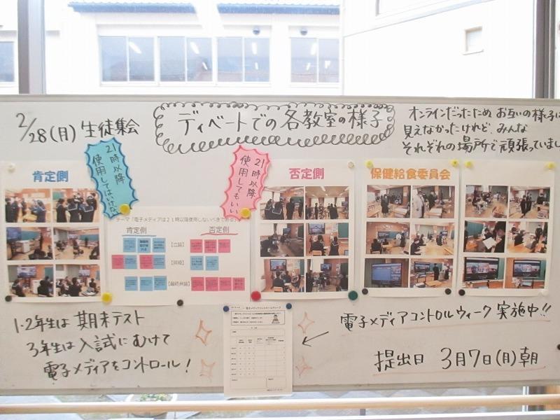 いよいよ明日,明後日(3月8日,9日)公立高等学校学力調査が行われます。3年担任から入試直前指導を真剣に受けていました。1,2年生からは合格祈願メッセージを玄関前に掲示しました。平常心でベストを尽くしてきてください。全員合格を心から祈っています。